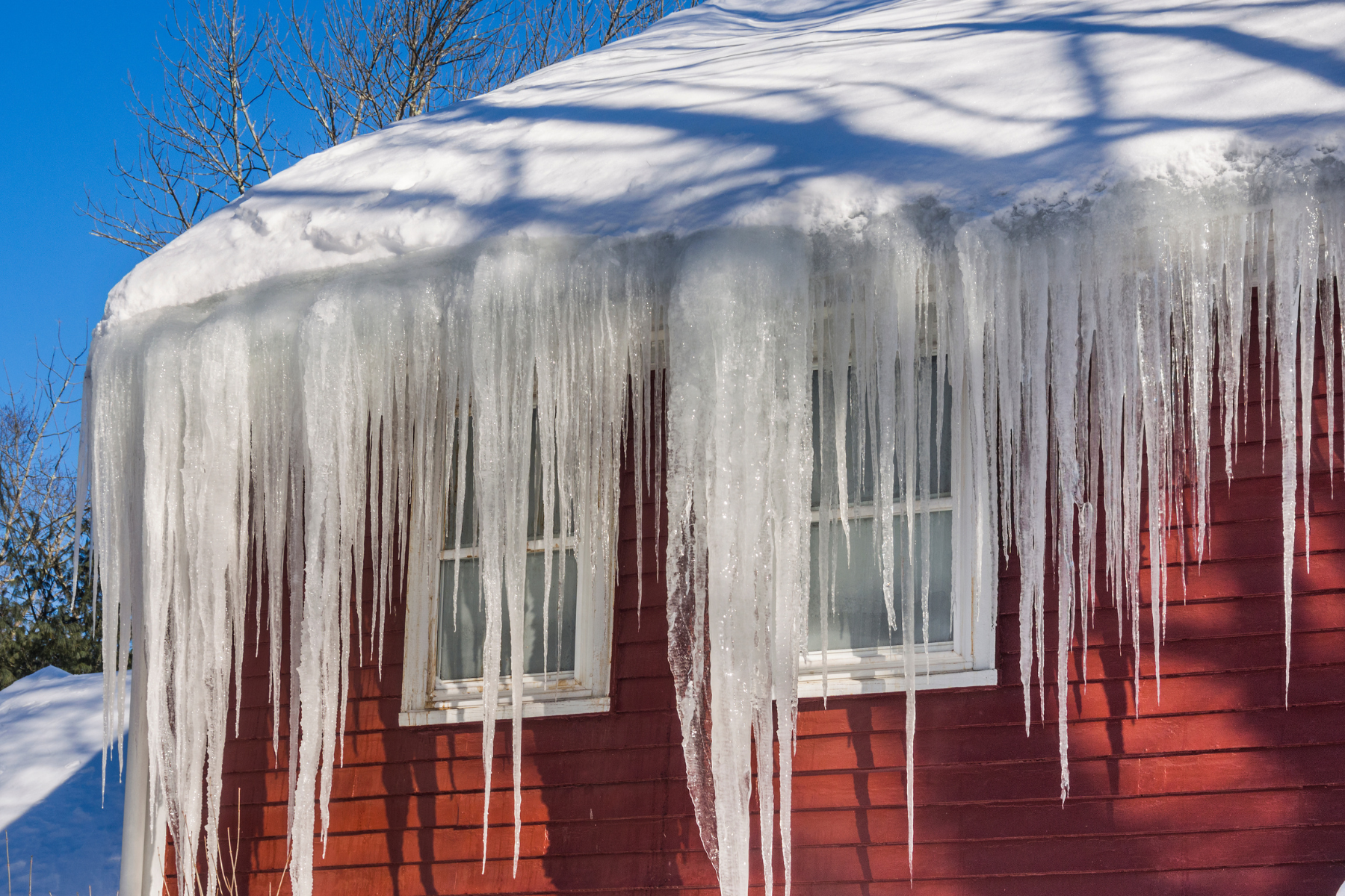 - Long, heavy icicles hanging from gutters and eaves (beyond normal buildup).